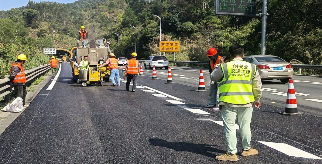 出行安全,標(biāo)線護(hù)航。潮莞高速惠州段標(biāo)線工程正在精心施工,我們以高品質(zhì)材料和專業(yè)工藝,精準(zhǔn)施劃每一條標(biāo)線,提升道路清晰度與辨識(shí)度,為您的暢行旅途筑牢安全防線 。