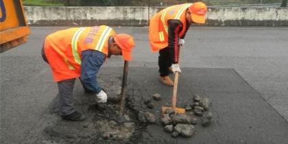? 對離析、松散現(xiàn)象的處理方法:對于松散現(xiàn)象面積較小的破損區(qū)域,將離析、松散的區(qū)域切割成規(guī)則的形狀,然后由人工用風鎬將該區(qū)域內(nèi)的上面層瀝青全部挖出,然后在其周圍及底面上噴灑乳化瀝青粘層油,采用細粒式(AC-10)熱拌瀝青混合料人工攤鋪、整平,采用雙鋼輪壓路機沿縱向碾壓。